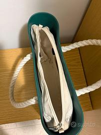 La borsa mostrata nell'immagine è un modello O bag, un marchio italiano noto per le sue borse componibili e personalizzabili realizzate in Compound termoplastico, un materiale gommoso, flessibile e resistente Dettagli del prodotto Modello: Si tratta del formato classico O bag Classic Colore: La scocca è in una tonalità di verde scuro, spesso identificata come verde bosco o verdone Componenti: La borsa è composta da una scocca in gomma, un interno in tessuto beige con chiusura a zip e manici a corda bianchi o color panna