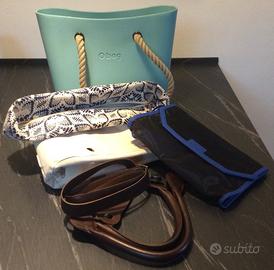 Borsa shopping OBAG iconica, scocca colore azzurro, sacca interna in canvas beige, manico lungo in corda. Altri accessori: manico lungo a cuore in pelle marrone, tracolla in pelle marrone, bordo in cotone fantasia blu/beige, organizer removibile colore blu/grigio. Borsa molto versatile, sia per la spiaggia che per la città. Dimensioni: cm 42 L x 30 h x 12 p.