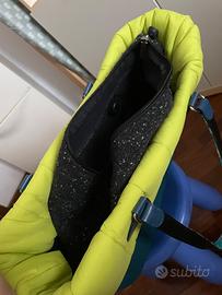 Guscio verde graffiato, risvoltò in piumino giallo e interno in pannò. Manico medio a fantasia