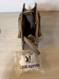 Vendo borsa Tote bag Onthego in Pelle Louis Vuitton grigio. Colore tortora/crema. Con cinghia per tracolla, gancio di chiusura borsa, ogni gancetto ha il logo o la marca Louis Vuitton. All’interno da un lato è presente una tasca con cerniera molto capiente e nell’altro lato due tasche.