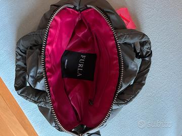Borsa originale Furla in tessuto nylon colore grigio scuro , piccola da passeggio con logo Furla evidente,originale, fosforescente. Dimensioni circa 30cm di lunghezza base, per 20cm di altezza. Fodera fucsia interna con tasca interna. Borsa in ottime condizioni usata poche volte ( vedi foto ) .