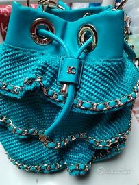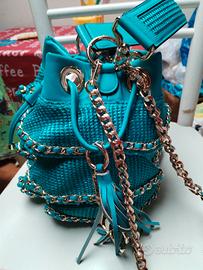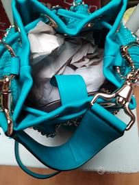 Borsa originale "La Carrie ", mai utilizzata, modello a sacca, con tracolla, tasca interna, color turchese/azzurro.