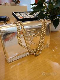 borsa oro con stampa due cuori sul davanti tipico di love Moschino. due manici a catena spaziosa all' interno . nuova con cartellino.