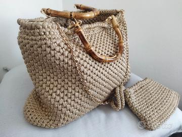 borsa artigianale in fettuccia oro pallido. manici in bambù vero e pochette abbinata borsa 42 x h.29 cm pochette 20x12cm