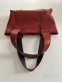 Raffinata borsa a spalla in morbida pelle, marca Carolina Herrera – colore rosso. I manici creano un motivo decorativo e sono fatti a fascia lievemente degradante verso l’apice, con retro e anelli di attacco di colore più scuro; chiusura a zip. Interno in tessuto con tasche – come nuova. Dimensioni lunghezza cm. 36 altezza cm. 24,5; peso 600 grammi