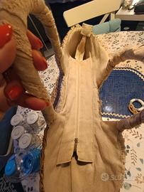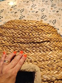 Borsa estiva in paglia, cotone e poliestere. Arricchita dal pizzo sul davanti , apertura a cerniera con fodera interna di cotone. Molto capiente. Come si vede in foto ha dei segni di usura, essendo ovviamente una borsa usata, seppur poche volte. Misure: massima larghezza 47 cm, base 18 cm, altezza 24