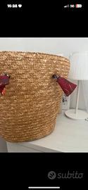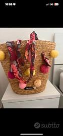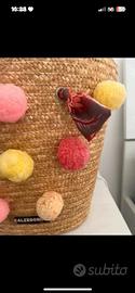 Bellissima borsa in paglia Calzedonia con pon pon colorati sul davanti e dentro completamente foderata con stampa floreale. All’interno ha pure una taschina, i manici sono regolabili essendo in stoffa. Misure: altezza 35cm e larghezza superiore 40cm. Super capiente, vendo perché doppione.