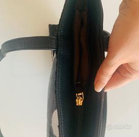 Borsa nera con paillettes. Con chiusura con cerniera. Tasca con cerniera interna e esterna. Misure: 33x40 cm
