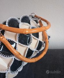 Nuova mai usata, trama particolare, borsa sottile, piccole/medie dimensioni , colori panna e nero con brillantini e manico tipo legno bambù.