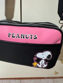 Borsa a tracolla Peanuts con bretella nera regolabile, perfetta per ogni occasione! Design super carino con Snoopy e Woodstock su sfondo nero e rosa. Doppia zip per massima praticità e tasca interna con cerniera.