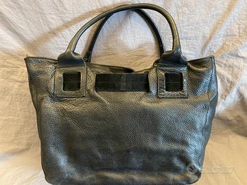 Bella e capiente borsa in pelle nera martellata morbida con fiocco in pelle camoscio passante che serve anche a ridurre o meno la profondità della borsa. manici lunghi si possono mettere anche a spalla. interno con due sacche porta telefoni e zip per documenti. zip che chiude la borsa. buone condizioni.