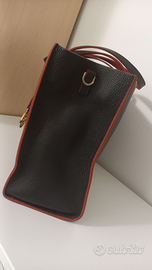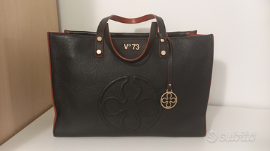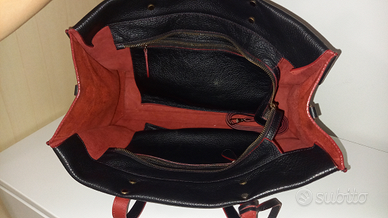 Borsa nera in vera pelle V°73 con profili e interno rosso, tracolla allungabile, 2 tasche interne capienti con zip dorata. Dim.38x14x26h cm. Vendo per inutilizzo, ottimo stato.