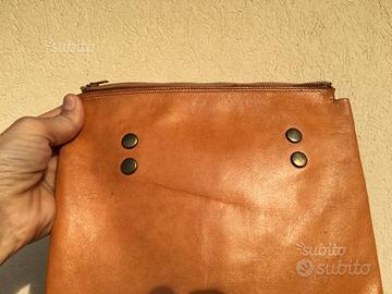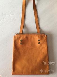 Color senape-arancione, misure 23x25 ma la particolarità è che si raddoppia e diventa 23x50 se lo desiderate. Ha due cerniere alle estremità quindi o borsa lunga (cerniera chiusa in fondo) o borsa corta con due vani uguali! Insomma fantastica ! Si porta comodamente a spalla. Prime foto alla luce del sole, le ultime in ombra per definire bene il colore.