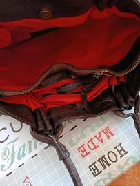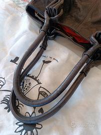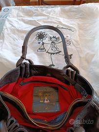 vendo borsa a spalla /a mano marchio "Le borse di Ludovica",quasi nuova,colore testa di moro,prevista di dust bag.Tre scomparti interni,di cui uno grande con la zip,un altra tasca interna più piccola sempre con la zip.Logo interno,fodera rossa in stoffa.Due manici di lunghezza 50 cm.Altezza borsa 35 cm, larghezza 45 cm circa.I due scomparti principali si chiudono sulla tasca interna grande con la clip.
