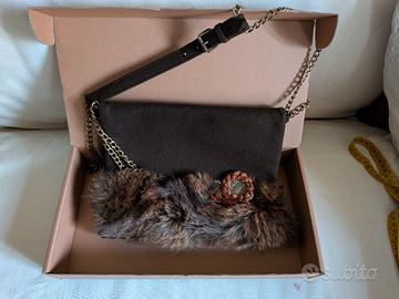 minimo restailing di una particolare borsa in stoffa con rifiniture in pelliccia, catena per tracolla e un piccolo "di più"