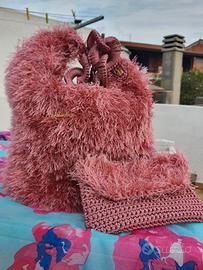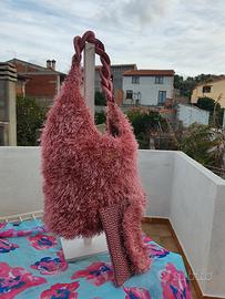 Borsa Dune chanel bag fatta interamente a mano in cordino "pelliccioso". La borsa è caratterizzata da una tracolla ad anelli intrecciati e rivestiti in cordino. Le parti metalliche decorative, sono color oro. Completa la borsa una pochette portatutto fatta dello stesso materiale. Le dimensioni sono: larghezza 35 cm, altezza 27 e profondità 15. La tracolla è lunga 65 cm.