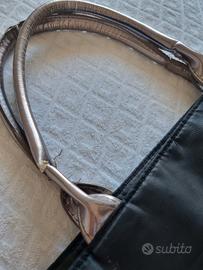 Borsa Monella Vagabonda nera con manici grigi di cui uno un po usurato misure 34x32,5 .tasca laterale esterna con marchio ,tasca interna e chiusura con zip