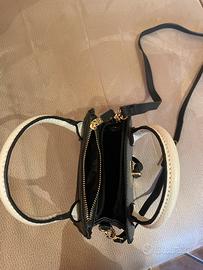 graziona mini-borsa in ecopelle nera con dettagli grigi e beige con tracolla regolabile staccabile e manici doppia chiusura a zip e due taschina interne di cui una con zip taschina con zip esterna motivo decorativo a fiocco sul davanti e dettagli in metallo color oro marca: carpisa misure: 18 x 15 x 7.5 vero affare, mai utilizzata
