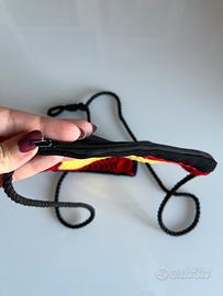 Borsa piccola con tracolla lunga nera, con ricamo colorato sul davanti.