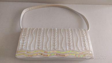 Borsa piccola ed elegante in raso panna con perline nella parte anteriore, tracolla corta in raso ( da portare a mano ) staccabile e doppia tracolla in corda panna da portare a spalla. Il manico si è un pò ingiallito nel tempo (vedi foto ) ma si può provare a lavarlo, per il resto è in ottime condizioni. Utilizzata solo una volta è ideale per matrimoni, comunioni, battesimi ecc.