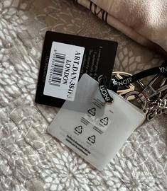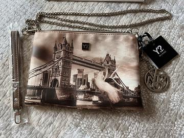 Pochette small Donna Y NOT? tema “LONDON” in ecopelle color tortora, tracolla a catena, manico, chiusura centrale con zip, tasca posteriore con zip, ciondolo staccabile, nuova con cartellino