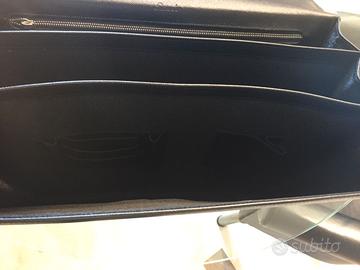 Borsa-cartella Pineider nera in pelle con due soffietti e quindi con triplo scomparto; modello 6867; larghezza 38-40 cm, altezza 28-30 cm. Nuovissima, mai usata. Prezzo di listino oltre 900 euro. Include sacca color giallino con logo Pineider.