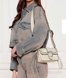 borsa pinko love bag mini one slouchy in pelle di colore bianco seta, con frange e 2 tracolle, misure 21x13x6, completa di scatola originale e cartellino identificativo