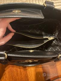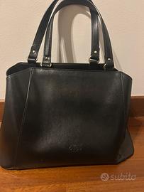 Borsa Pinko nera media grandezza , si può portare a mano, splla o tracolla. Abbastanza capiente con tre scompartimenti, i due più grandi e uno centrale con la zip, e una tasca interna. Vi è anche una piccola tasca esterna che si può aprire dal logo di Pinko. Presenta una piccola derformazione in basso a destra.
