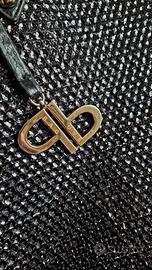 Borsa in tessuto nera, dettagli in pelle, lato frontale con piccole paillettes.