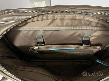 Cartella in pelle naturale con doppio manico, tracolla regolabile e rimovibile e chiusura con zip a doppia direzione.