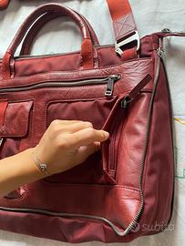 Borsa di grandi dimensioni con tracolla regolabile e manici di colore rosso scuro. Piena di tasche e tanti scompartimenti con zip o bottoni, con parti in pelle e altre in tela, comodissima come 24 ore per lavoro o studio. Marca Piquadro e in perfette condizioni. (Mando altre foto su richiesta)