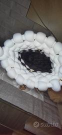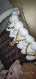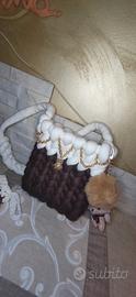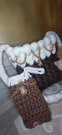 Questa borsa e realizzata a mano utilizzando un particolare filato chiamato marshmallow l'oggetto principale è una chunky bag bicolore marrone e bianco caratterizzata da una trama a intreccio molto voluminosa 🥰 presenta anche una tracolla intrecciata con lo stesso filato una catenella decorativa dorata con un ciondolo a orsetto.. in abbinamento un portacellulare adatto a tutti i tipi di smartphone 🥰