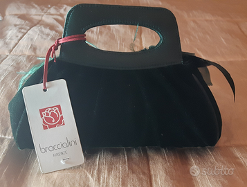 Stupenda borsa pochette originale Braccialini in velluto verde scuro impreziosita con fiore gioiello e piume.