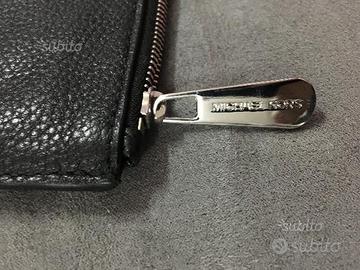 Vendo clutch Michael Kors originale in pelle martellata nera, con chiusura con zip metal, logo del brand applicato in alto e comodo cinturino da polso. All'interno presenta funzionali interni foderati e suddivisi in porta tessere e una tasca a filo. Utilizzata poche volte infatti non presenta segni di usura ed è in eccellente stato. Prezzo trattabile. Spese di spedizione incluse, possibilità di spedizione in tutta Italia. Contattare tramite email.