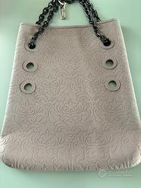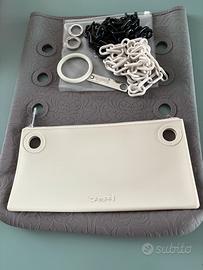 diversi modi secondo il posizionamento delia catena negli occhielli . Color grigio . Catena nera in plastica leggera con moschettone e targhetta locata in metallo . La pochette in silicone si presta a diversi utilizzi . Da portare a mano / porta documenti da viaggio / accessorio da agganciare alla borsa . Catena beige in plastica leggera / chiusura con cerniera. Bracciale in silicone beige . Mai usata. Ottimo statoz brand Dampai .