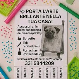 Realizzo a mano queste splendide borse e pochette utilizzando la tecnica Diamond Painting. Ogni dettaglio è rifinito con cristalli luminosi applicati uno ad uno, rendendo ogni pezzo un'opera d'arte da indossare.