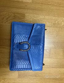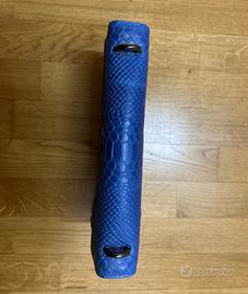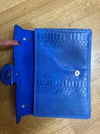 Borsa in vera pelle di dimensione media e fantasia coccodrillo di colore Blu Elettrico con fibbia a ferro di cavallo senza tracolla (i passanti presenti in alto vi permettono di attaccare qualunque tracolla di vostro piacimento). In ottime condizioni. Presenta una tasca sul retro e due compartimenti interni con tasca divisoria interna con chiusura a zip e tasca interna con zip come visibile in foto. Chiusura a bottone.