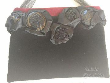 Borsa l'artisan du liban in velluto nero con bordo bordeaux, tracolla in raso e decori rose con bottoni al centro. Nuova mai usata