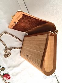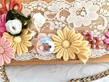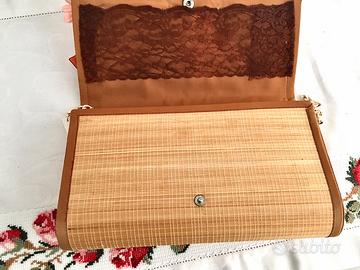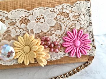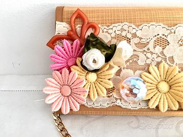 Borsa pochette made in Italy nuova in paglia rivestita internamente in stoffa. Decorazione con pizzo fiori in tessuto e con elementi in resina. Dimensione cm 25,5 x 14,3 c.a.