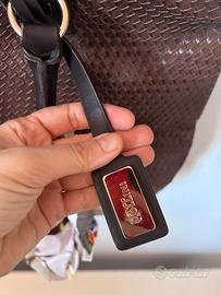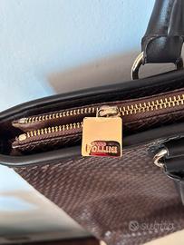 Vendo borsa marca Pollini originale, colore marrone, in pelle intrecciata, con fodera interna intatta. La borsa non ha segni di usura, se non una lievissima usura dovuta all’appoggio negli angolini sotto. Non ha buchi o strappi. Internamente ha una tasca con cerniera non tanto grande e alcune tasche aperte. La borsa si chiude con cerniera.