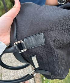 Elegante borsa in tessuto nero, originale Pollini, perfetta per chi cerca stile e praticità in un unico accessorio. Il design raffinato la rende adatta sia all’uso quotidiano che a occasioni più formali. Dotata di comodi manici per essere portata a mano e di tracolla regolabile e allungabile, offre massima versatilità e comfort. Gli interni sono spaziosi e ben organizzati, ideali per contenere tutto il necessario con ordine. La borsa è usata, ma in buone condizioni: ben tenuta, con qualche difetto negli angoli, pronta per essere utilizzata da subito.