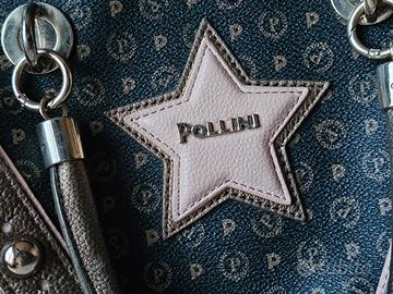 borsa in pelle saffiano logato con simbolo storico Pollini, color nero con logo color bronzo come i particolaridel motivo ed i manici in pelle. corredo completo degli ulteriori manici e della tracolla , tutti mai utilizzati. segni di usura/sfregamento sugli angolo come da foto . misura 30x20x18 cm