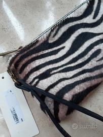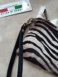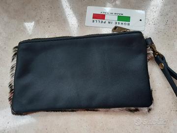 Vendo borsetta da polso, pochette, anche utilizzabile come portafoglio, in vera pelle e pelliccia tipo cavallino, zebrata. Nuova, mai utilizzata, ancora con cartellino Borse In Pelle - Made In Italy. Il colore della pelle è marrone scuro, testa di moro. Dimensioni: 10 x 20 cm. Lunghezza polsiera: dal moschettone, circa 19 cm.