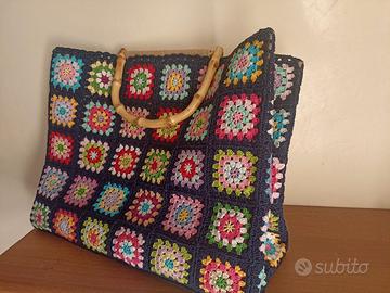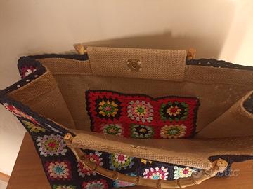 Borsa di canapa rivestita con piastrelle granny a uncinetto con cotone di ottima qualità, con manici in bambù e chiusura magnetica, misure 30x31x13 Fatta a Mano.
