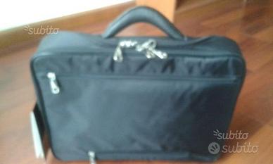 Due scomparti principali all'interno, uno per il computer portatile l'altro per i documenti. Ha due ampie tasche sul davanti e un'apertura posteriore che permette di fissarla alla maniglia di un trolley.