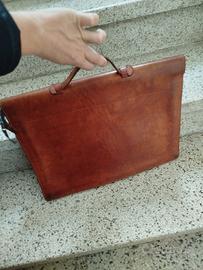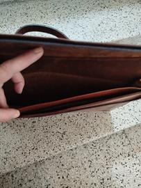Borsa porta documenti in pelle ben tenuta con cerniera perfetta e scorrevole che chiude la borsa, 2 scomparti per i documenti e manico in pelle. Marchio Valextra Milano.