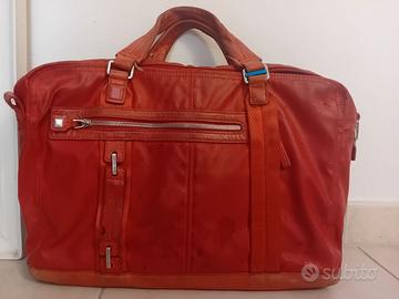 Color rosso corallo, bellissima borsa a mano con rifiniture in pelle. Parti impermeabili esterne deteriorate nell'uso, interni in tessuto in perfette condizioni.
