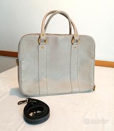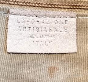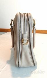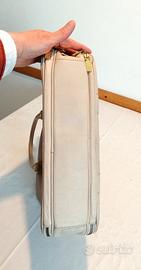 Bella borsa portadocumenti in pelle, colore beige, rifiniture in metallo dorato, tre grandi scomparti, quello centrale con cerniera a doppio cursore, quelli laterali con cerniera e apertura a "soffietto", doppia maniglia. Non ha tracolla, sono presenti gli anelli per poterne agganciare una. Io l'ho utilizzata con la tracolla marrone che si vede in fotografia e che, se gradita, regalo. Borsa utilizzata, mostra alcuni segni d'uso, (si osservino attentamente le fotografie), ma è ancora bella e può fare molta strada. Larghezza 36,5 cm. Altezza 28 cm. Profondità alla base 10,5 cm circa. Nel mio profilo puoi trovare altre borse e molte interessanti idee regalo.
