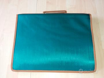 Borsa portadocumenti in tessuto verde e pelle marrone cognac, marchiata Sasa. Con 3 scomparti interni.