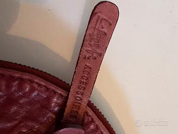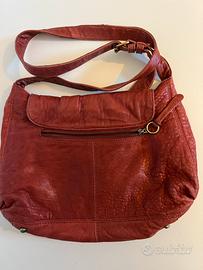 Borsa modello “postina” in vera pelle color rosso scuro. Interno foderato in tessuto. Molte tasche. Tracolla. Marca Lafayette. Comprata a Parigi.